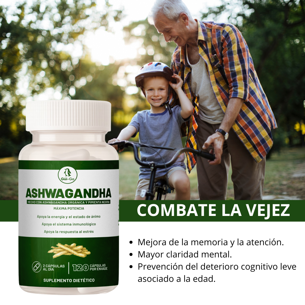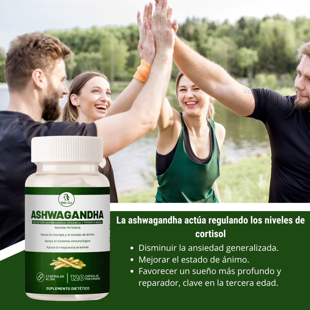Reducción del estrés y la ansiedad: La ashwagandha es un adaptógeno que ayuda a controlar el cortisol y promover la calma mental.