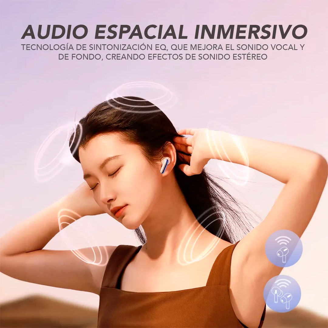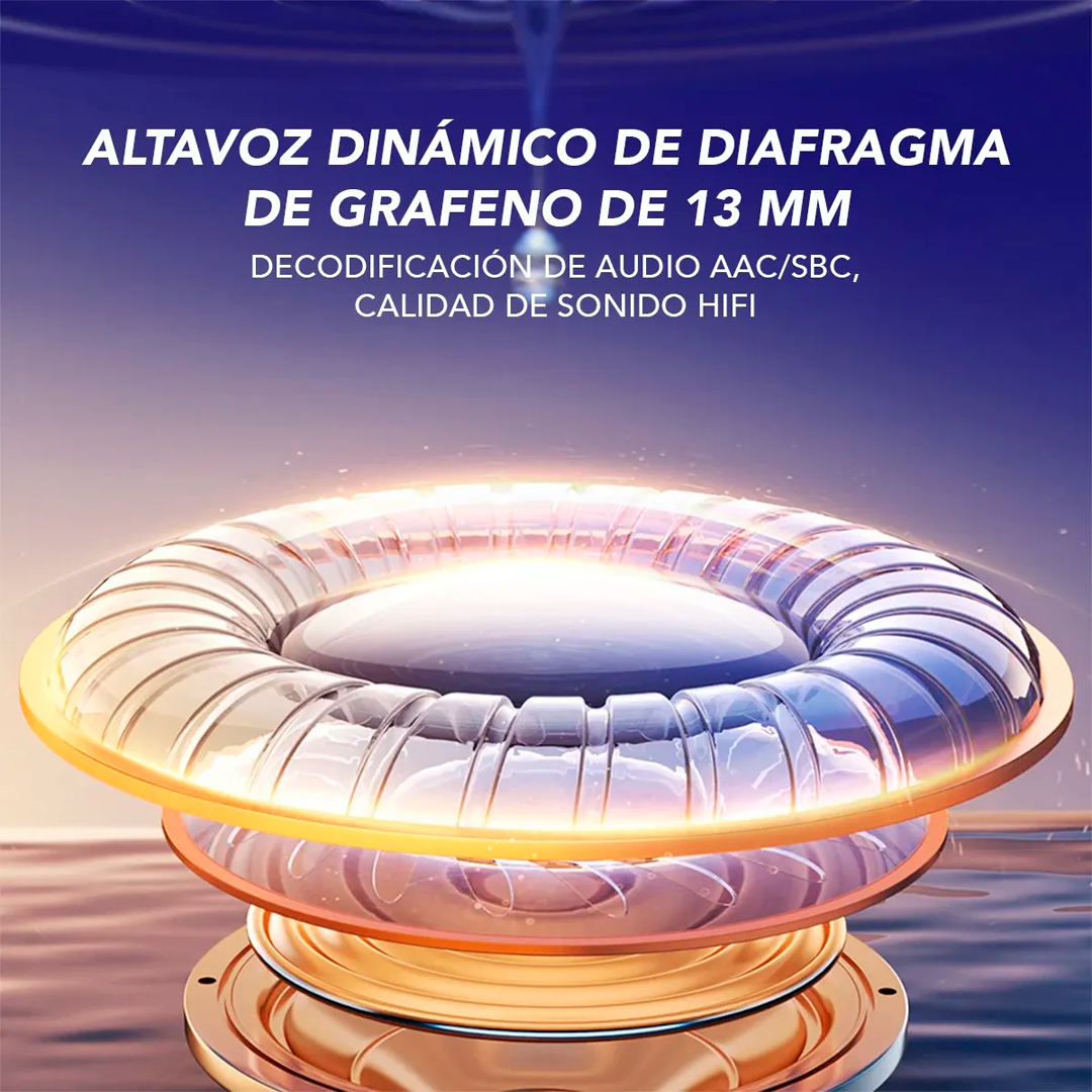 Equipados con altavoces dinámicos de 13 mm, proporcionan un sonido equilibrado con graves profundos, medios limpios y agudos definidos, optimizados para todos los géneros musicales. La tecnología Bluetooth 5.3 garantiza una conexión más rápida y estable, mayor eficiencia energética y menor latencia en reproducción multimedia y videollamadas.