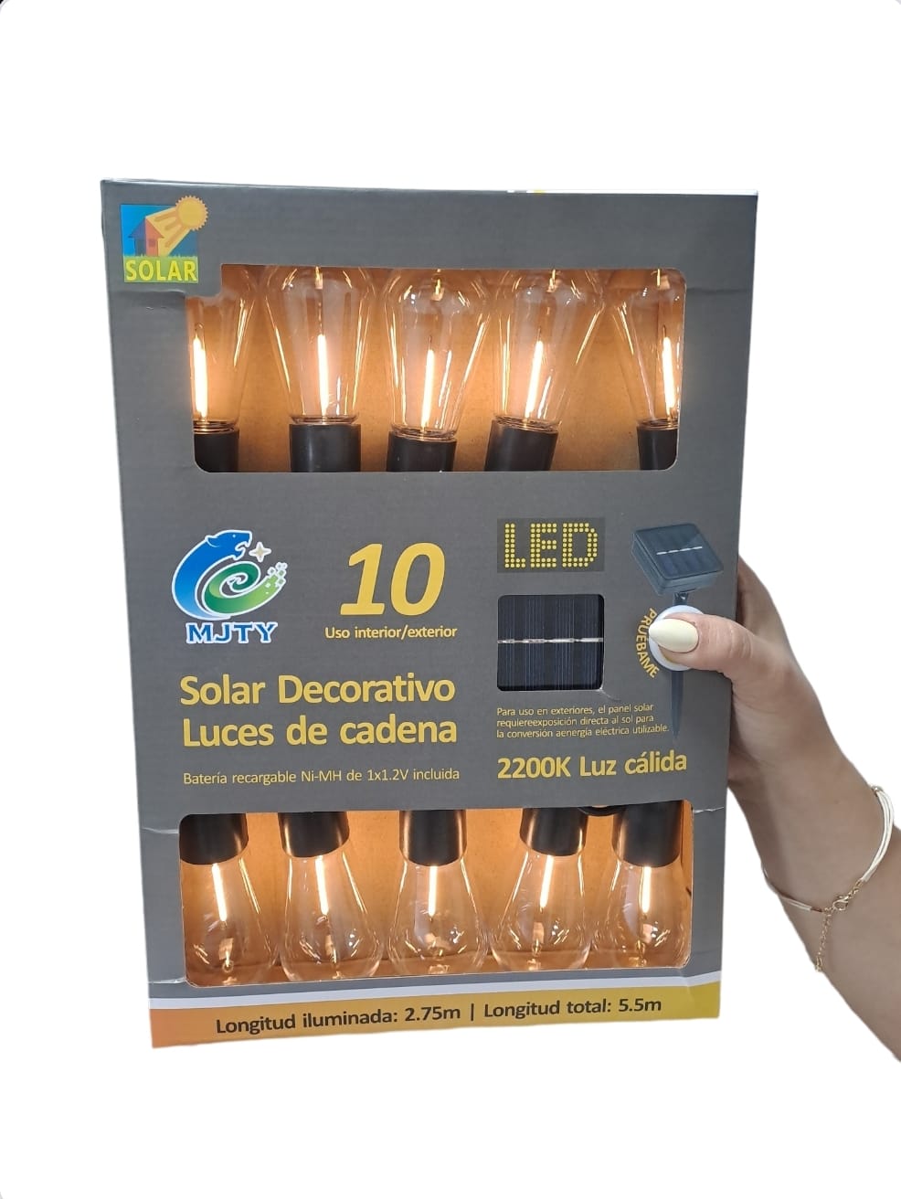 Guirnalda 5.5 Metros Panel Solar Con 10 Ampolletas Led Calida Color Negro’ es una fuente de iluminación dual especialmente diseñada. Se puede cargar con paneles solares en días soleados, y también a través de la fuente de alimentación plug cuando no hay luz solar. Una carga completa puede durar más de 8 horas, proporcionando una compañía nocturna constante.